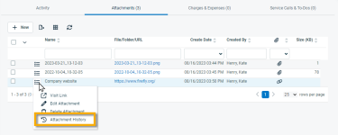 The Attachment History, Note History, and Time Entry History pages provide a record of every activity performed on the item from the time the feature was released. To open the page, use the path(s) in the Security and navigation section above.