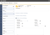 - Depending on the selected organization category and your security permissions, three optional components may appear on the Main panel: Create a Contact, Create a Note, and Create a To-Do. Select the check box to expand a section and populate all required fields. Refer to Contact field descriptions and Note and to-do field descriptions.