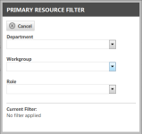 Primary Resource | Select a Primary Resource for the ticket. The Primary Resource is the person who is responsible for the ticket. Only resources who are members of at least one queue will appear on the drop-down list. Using the filter Select the filter you would like to apply to the Primary Resource drop-down list. You can show resources for a department, workgroup, or role. When you select an option, the page closes, you are returned to the ticket, and the Primary Resource drop-down list contains only resources for the specified department, workgroup, or role. Using the Find Resource wizard You can use the |