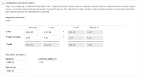 When you create or edit the project, you can enter your financial expectations for the project into the Revenue, Sales Cost, and General Expense % fields. The Original Estimate values serve as a baseline, and are compared to the current numbers you can enter into the Revenue and Costs fields for Labor and Project Charges. Totals, Profit and Margin % are automatically calculated.