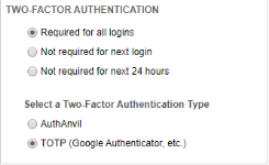 IMPORTANT  AuthAnvil is only available for customers already using this 2FA option. If you are not already using AuthAnvil, these fields will not be displayed. Please refer to Configuring a 2FA app.