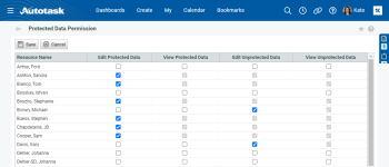 The Protected Data Permission page lists all resources in your Autotask instance, and four columns of permissions that control data access.