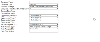 - Opportunity Stage - Select an appropriate Opportunity Stage from the list as the default opportunity, probably what you would consider Stage 1. Opportunity Stages are set up in Admin so your company might have a stage specifically for Opportunities created through AutoForms.