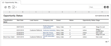 This report provides a summary of the activity on opportunities with start dates within a specific time frame for a selected opportunity owner. It displays opportunity sources, statuses, and stages in addition to the number of notes that have been added to each. Opportunities without notes will not be included on this report. |