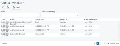 [Entity] History pages track the date and time of the change, the action and field that was changed, the Changed from and Changed to values, and the resource who initiated the change. This includes changes made directly on the ticket, through workflow rules, or by the API or an API User.