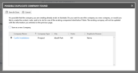 - Click a Save option. Autotask performs a duplicate check on the organization and, if the organization was a duplicate, the contact. Refer to Duplicate checking.