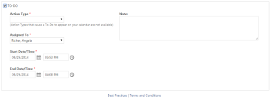 The To-Do option on the Contact Action page allows you to create a to-do and associate it with up to 2000 group contacts at once. Action types that have a view type of Calendar or Both (which means they display on the calendar or Dispatch Calendar) are not available.