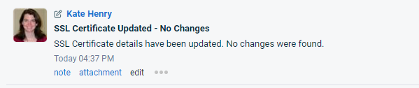 If domain & SSL certificate tracking is enabled, domains and SSL certificates are checked on a regular schedule. Additionally, you can manually initiate the auto-update service, as well. Every time a check is performed, a system note is generated.