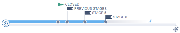 Stage Flags appear on the upper bar of the timeline, and each one represents a change in the stage of the opportunity. The flag is labeled with the name of the stage it was changed from on that date. If there are more stage flags than there is room to represent, they are bundled in a single flag labeled Previous Stages.