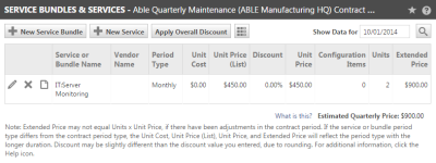 Because the Quarterly contract period is of longer duration than the Monthly service bundle period, the table displays the Quarterly Cost and Price. There are 2 Units, so the Extended Price = Unit Price X 2, or $900. The Estimated Quarterly Price listed below the table = $900.