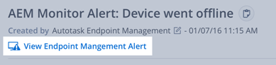 This link is only displayed on tickets of type Alert that were created by the Datto RMM integration. Clicking the link will open the original alert in Datto RMM. Refer to Access the Datto RMM alert associated with a ticket. |
