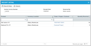 It will display all purchase order items received with this shipment, their inventory location, and links to the associated ticket, project or contract. The table data is read-only.