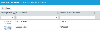 When you place a purchase order with a vendor, there is no guarantee that all items will be shipped in one shipment, or invoiced on one invoice. The Receipt History and the Receipt Detail pages help you sort through multiple shipments and invoice numbers associated with the PO.