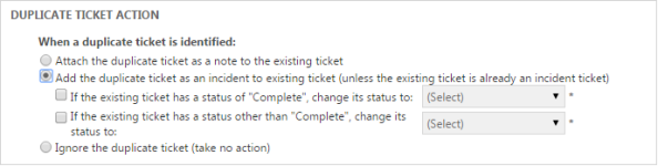 To specify how Autotask should handle an incoming ticket that meets the duplicate ticket definition, check one of the radio buttons under Duplicate Ticket Actions. Depending on the radio button you select in this section, your check box options will change: