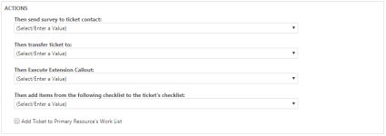 Then send survey to ticket contact: | Click the drop-down menu and select the survey that will automatically be sent to the Ticket Contact when the workflow rule fires. |