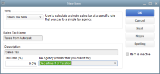 IMPORTANT  Do NOT calculate taxes in both Autotask and QB! If you have enabled Transfer Taxes Directly, we recommend that you disable the calculate Sales Tax feature in QB, or at least select a tax group that will not add taxes to the invoice (such as Out of State). Otherwise, your customers will be charged both the taxes calculated in Autotask and transferred to QB (where they appear as a line item), and the taxes QB calculates and adds to the invoice.